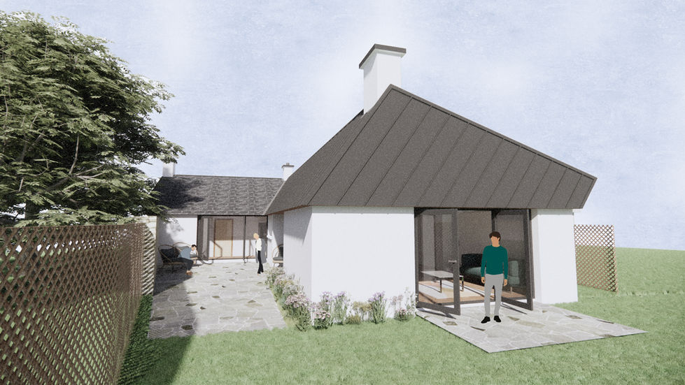 Our clients approached us seeking a refurbishment and extension to these wonderful twin cottages under one roof in the heart of Greencastle in Inishowen. The new plan allows the two tiny cottages to become one bedroom wing, which is bolstered by the new contemporary kitchen, dining and living area extending to the southwest.